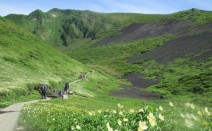 9日はタケダスポーツトレッキングツアーで秋田駒へ。 2名キャンセルで3名の参加。タケスポスタッフと私を含め5名でのんびりフラワーハイク。 チングルマ咲くムーミン谷の景観は素晴らしく、 大焼砂のコマクサ大群落も見事です。 鳥海山…