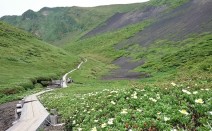 19日はムーミン谷へ行きたいというリクエストで盛岡のリピーター2人と秋田駒へ。 晴天の日曜日とあって、国見温泉登山口駐車場は満杯、路上駐車の車、車、車。 私たちは午前10時ちょっと前スタートで、遅い歩き始めだったためムーミン谷…