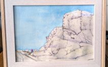 透明水彩画2L版 早池峰の鉄梯子を登る登山者 ボールペン画なので デッサンは簡単にして 岩場の大まかな亀裂を捉え 蛇紋岩を黄土色ではなく 極薄い紫色で彩色し 光を受けて白く見え 青空とのコントラストが 際立つようにしてみました。